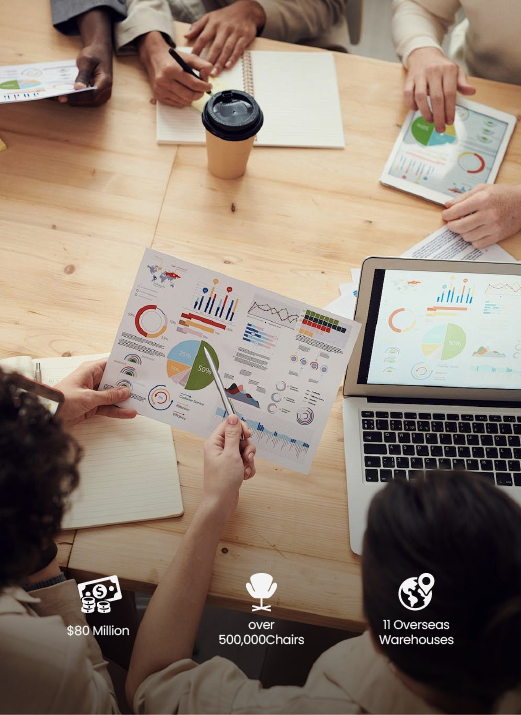 Our momentum continued to grow. By 2024, Colamy reached $80 million in annual sales, with over 500,000 chairs sold worldwide. We expanded to 11 overseas warehouses, including 6 in the United States, ensuring faster delivery and a smoother customer experience.