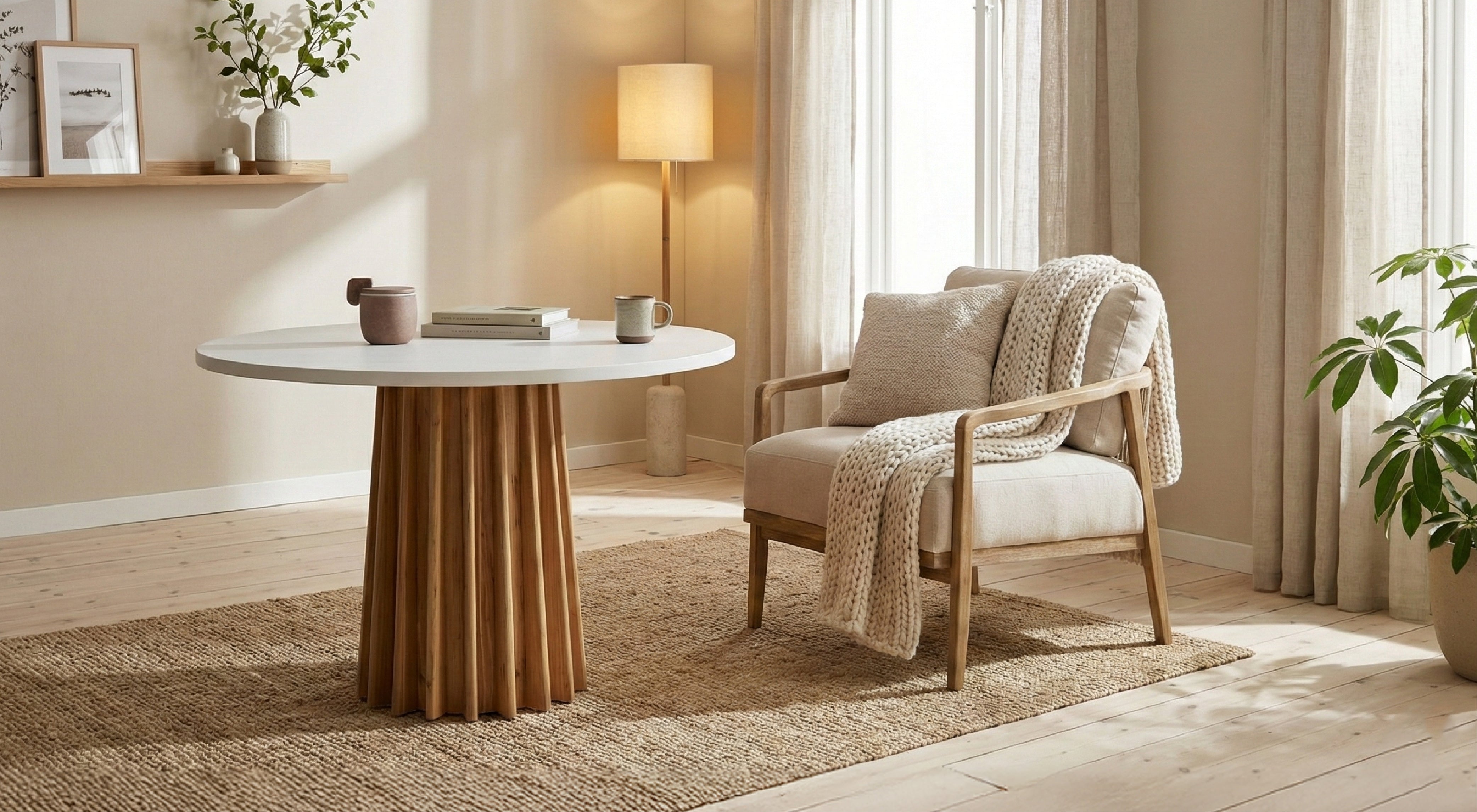 Bring modern minimalism and warm natural texture into your dining space with the COLAMY Arlo Cement-Finish Round Dining Table. This sculptural centerpiece features a smooth, matte cement-look tabletop applied with a refined micro-cement technique, paired with a solid pine fluted pedestal base that adds architectural character and organic warmth.