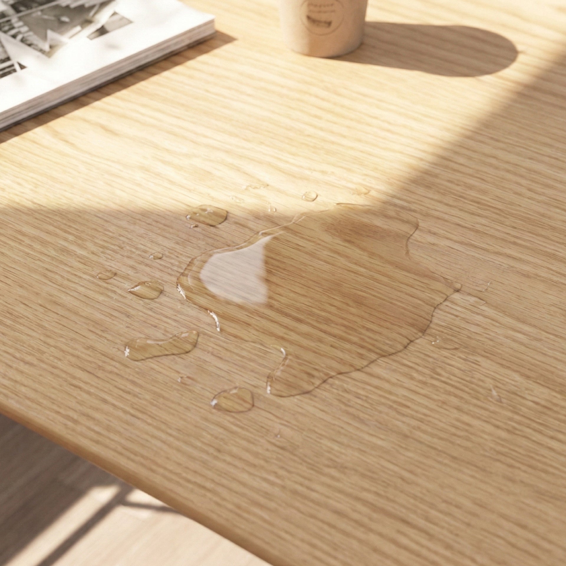 Using placemats, coasters, and regular gentle cleaning helps preserve the surface. The tabletop’s engineered finish is designed for everyday dining and is easier to maintain than untreated wood.