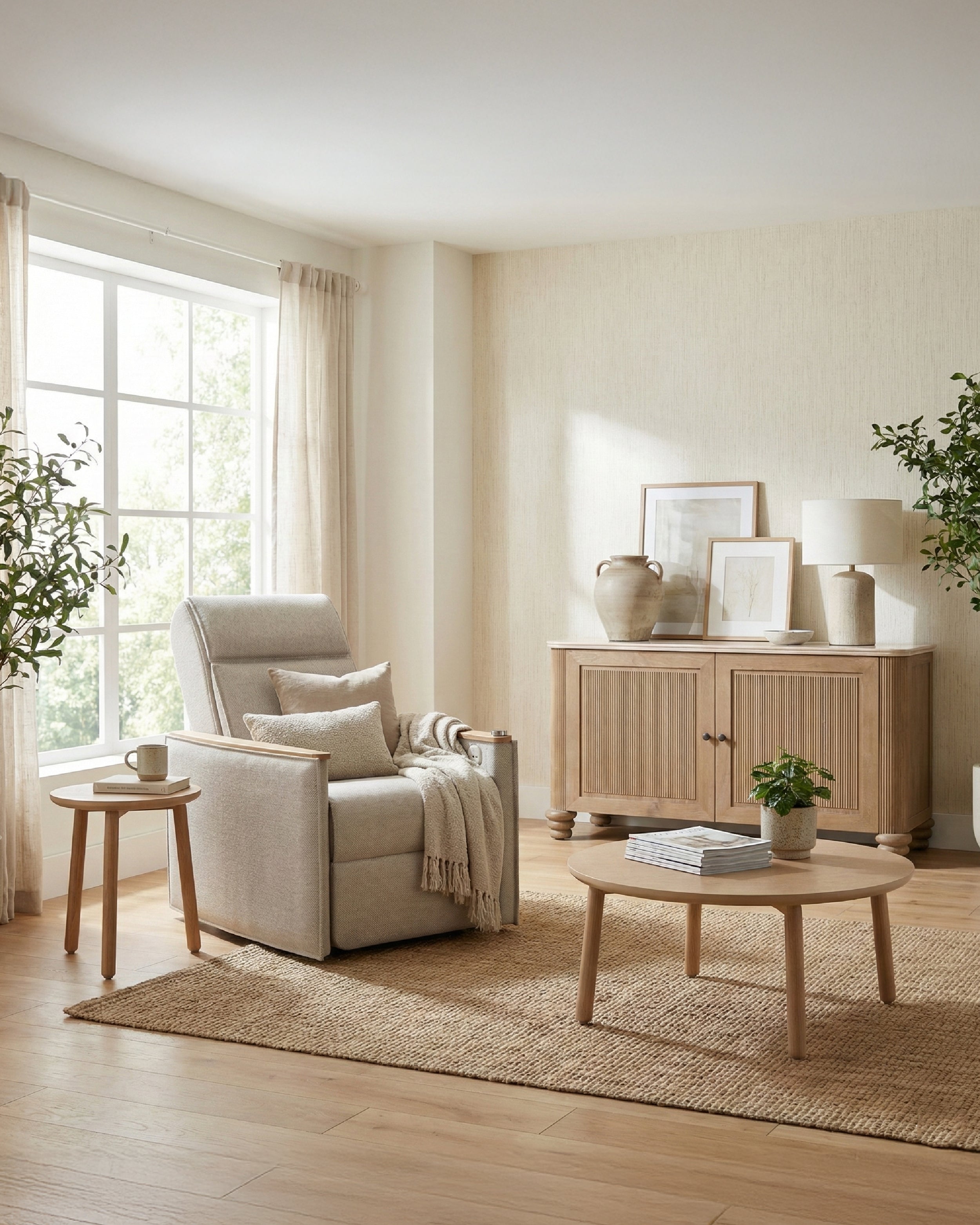 Paired with sculptural cabinets, a modern coffee table, and elegant side tables, VERTA completes the space with a composed presence—elevating the living room through balance, texture, and proportion.