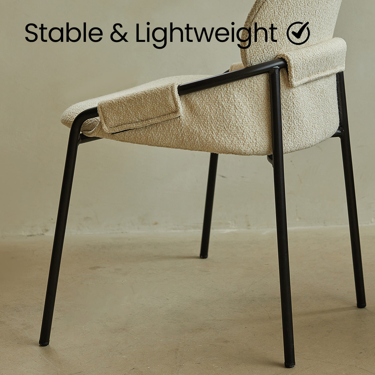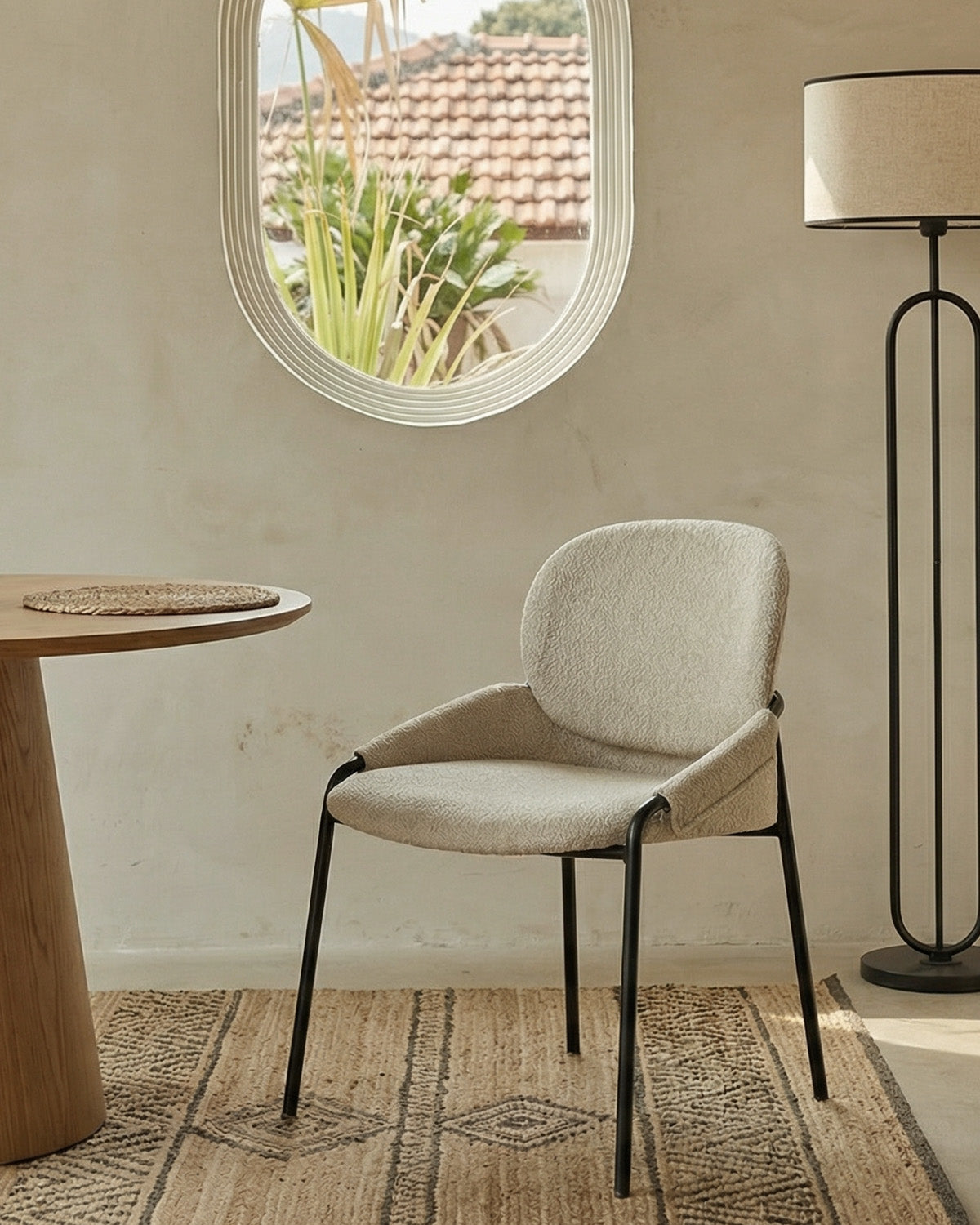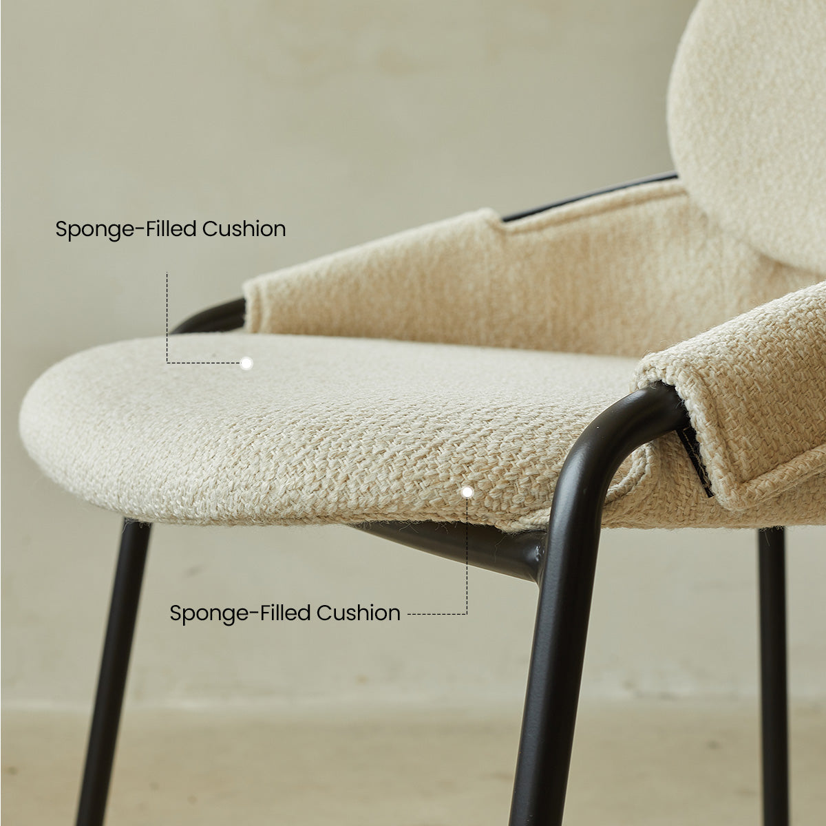 The neutral upholstery and black frame are intended to complement a wide range of modern decor styles.
