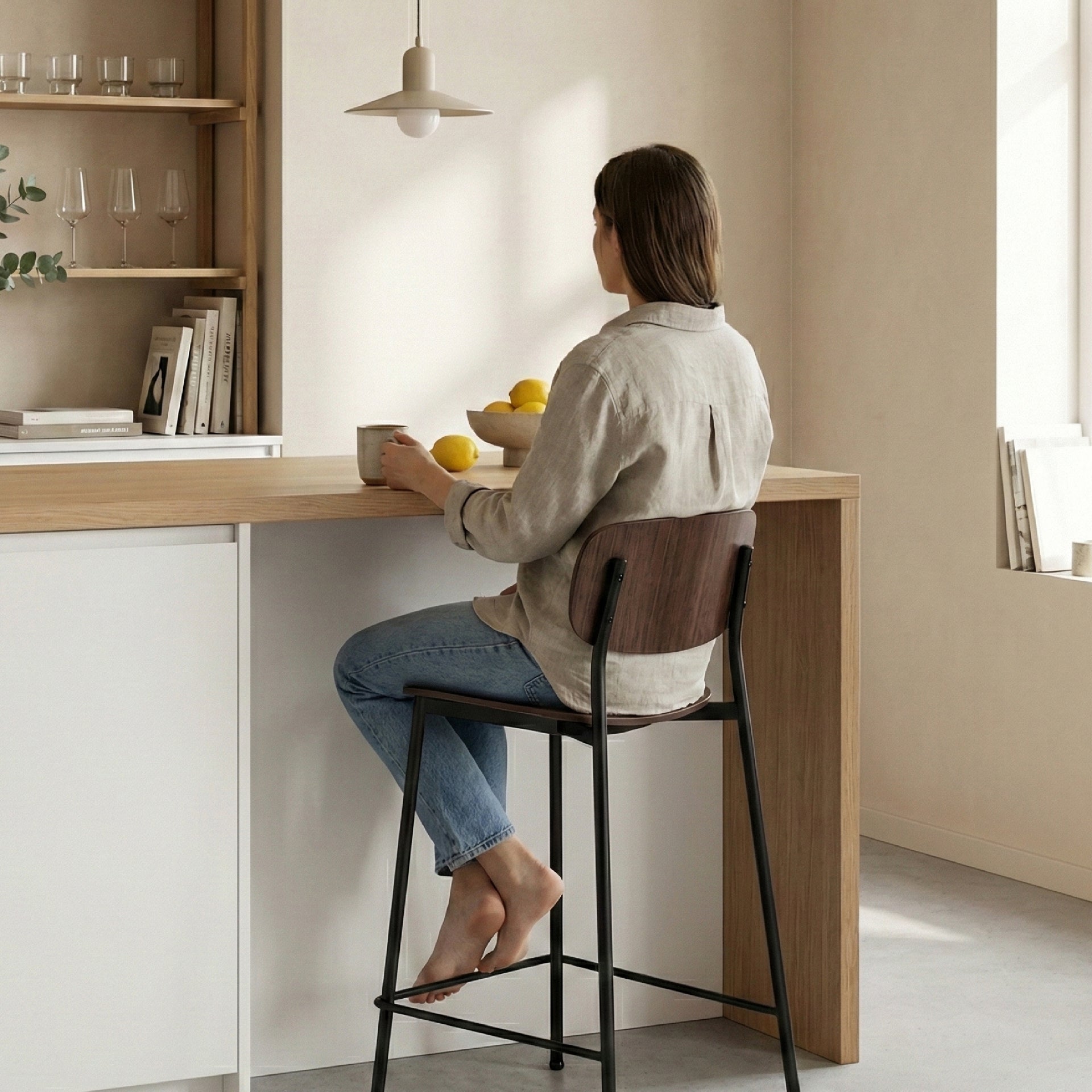 Functional and refined, the COLAMY ORINO Modern Bar Stool blends natural wood warmth with modern structural strength. Featuring a molded plywood seat shell finished in oak veneer with an oak-tone coating, paired with a slim steel frame, ORINO delivers a clean, contemporary look ideal for kitchen islands, home bars, cafés, or restaurants. The ergonomic curved backrest and standard bar height provide comfortable support for extended seating without compromising visual lightness.
