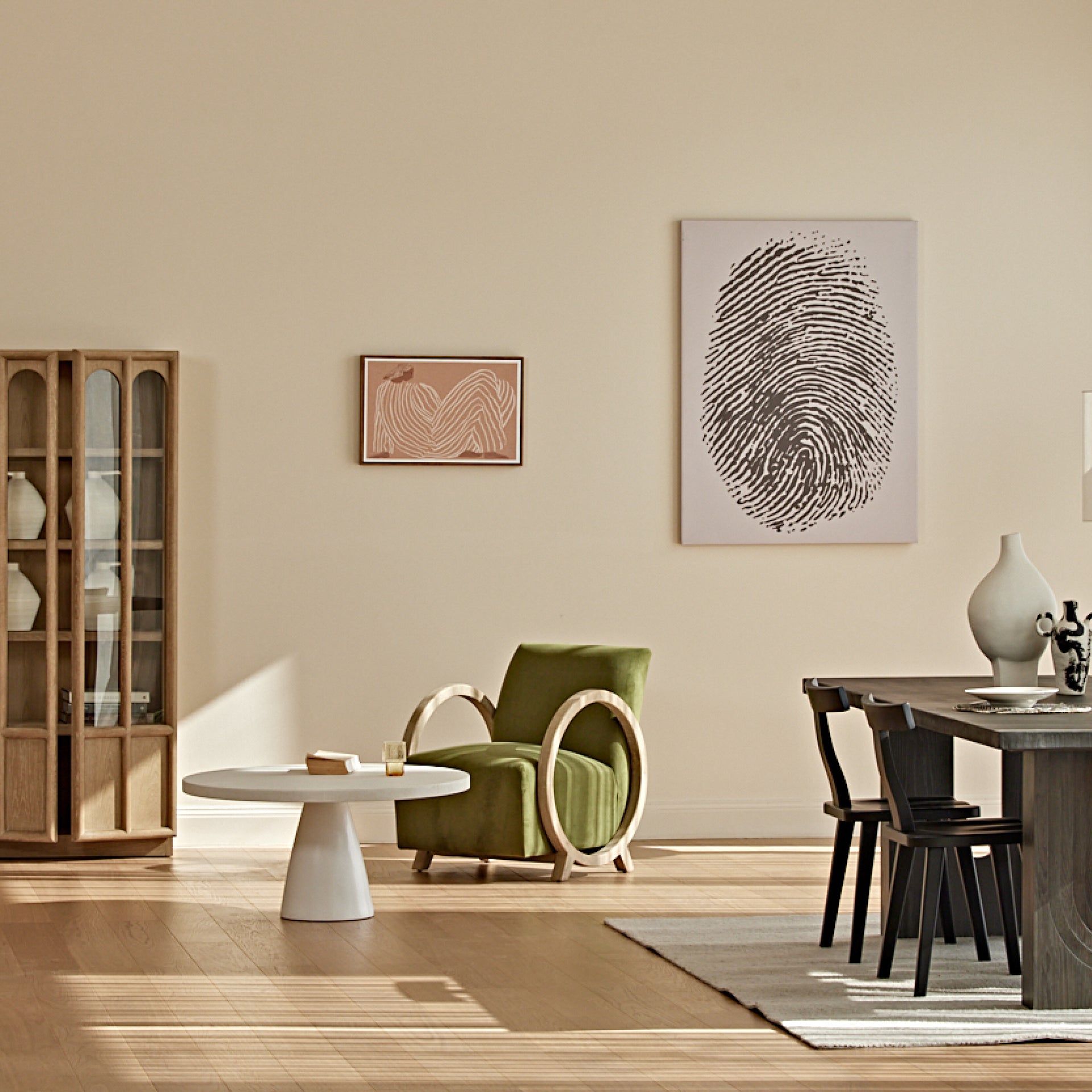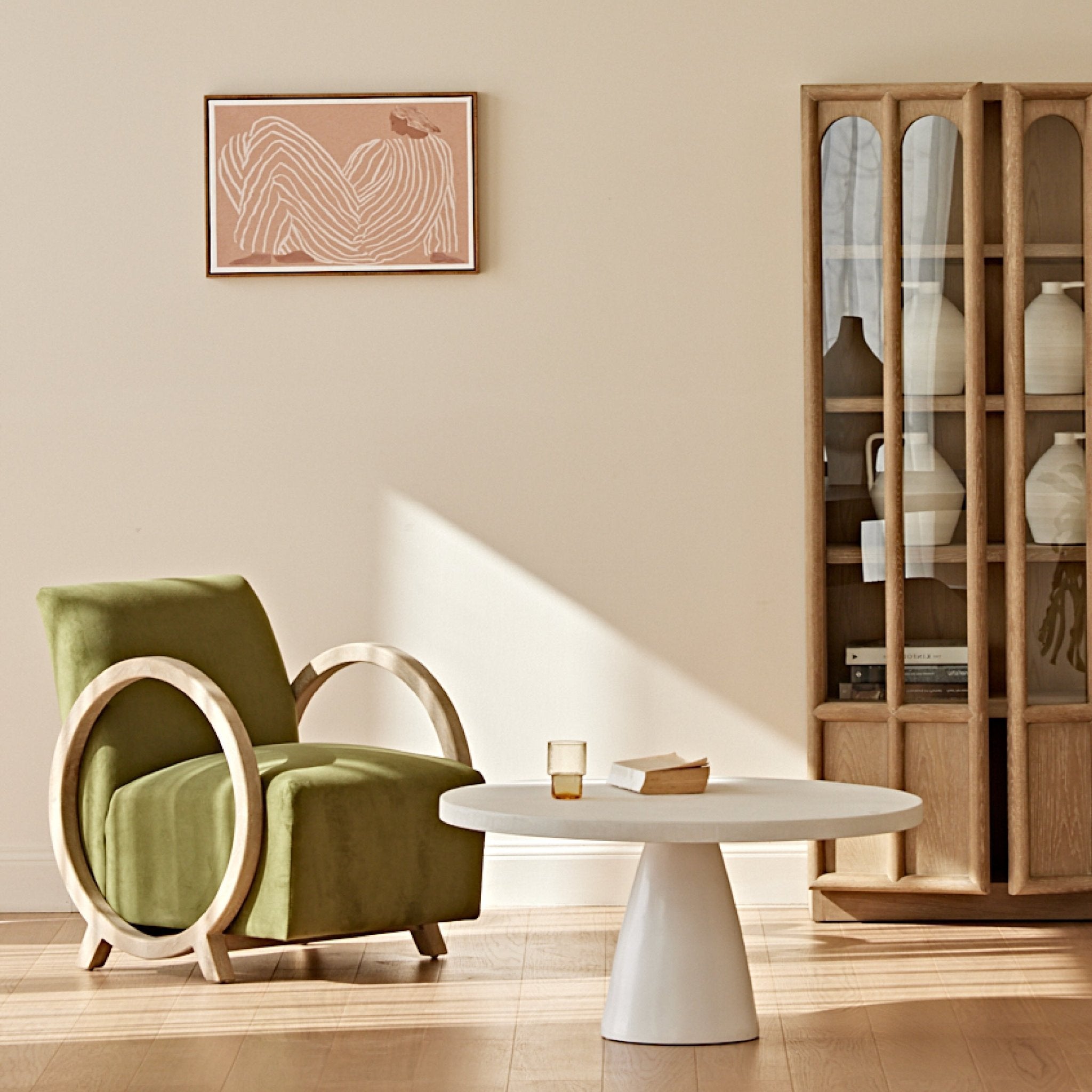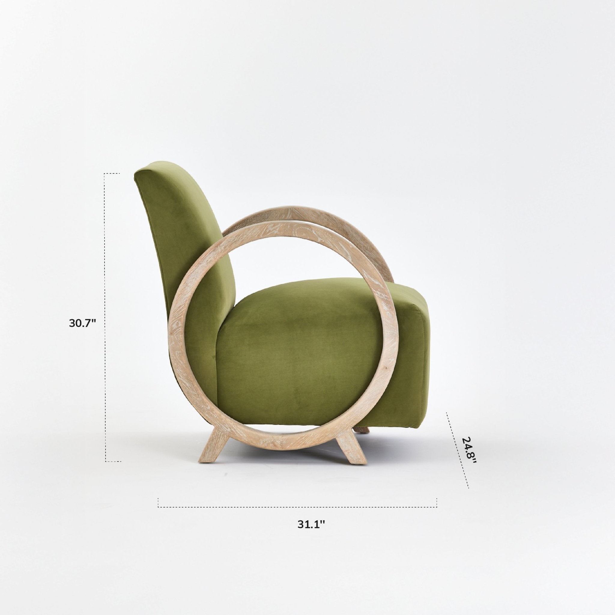 Introduce sculptural elegance and modern comfort to your space with the COLAMY VEYRA Accent Armchair. Defined by its distinctive circular oak armrest design and plush green velvet upholstery, VEYRA balances artistic form with everyday functionality. Built on a solid smoky grey oak frame supporting up to 265 lbs (120 kg), this armchair offers reliable stability, refined texture, and a bold visual statement for contemporary living spaces.